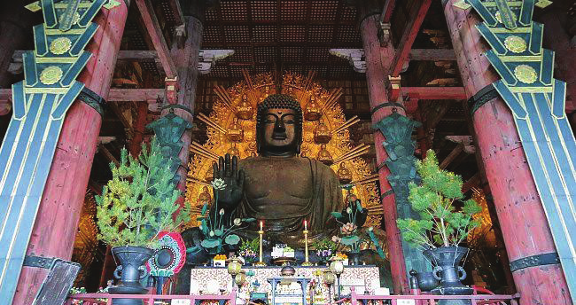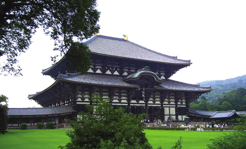 The Todaiji Temple or 'Great Eastern Temple' is one of Japan’s most famous and historically significant temples and a landmark of Nara. The Temple was constructed in 752 as the head temple of all provincial Buddhist temples of Japan and grew so powerful that the capital was moved from Nara to Nagoaka in 784 in order to lower the temple’s influence on government affairs. Todaiji's main hall, the Daibutsuden (Big Buddha Hall) is the world's largest wooden building, despite the fact that the present reconstruction of 1692 is only two thirds of the original temple hall's size. The massive building houses one of Japan's largest bronze statues of Buddha (Daibutsu). The 15 meter tall, seated Buddha represents Vairocana and is flanked by two Bodhisattvas. Another popular attraction is a pillar with a hole in its base that is the same size as the Daibutsu's nostril. It is said that those who can squeeze through this opening will be granted enlightenment in their next life !